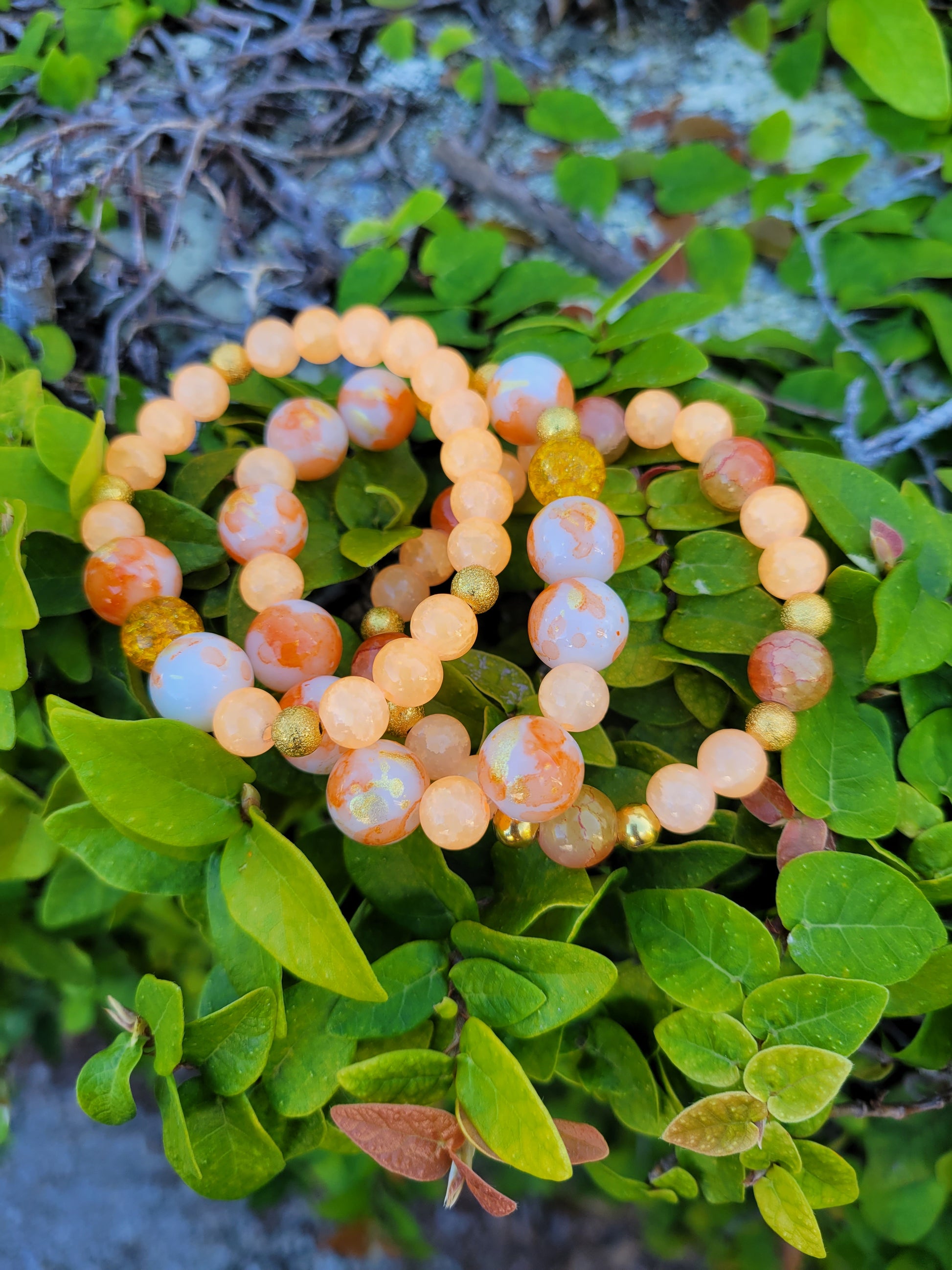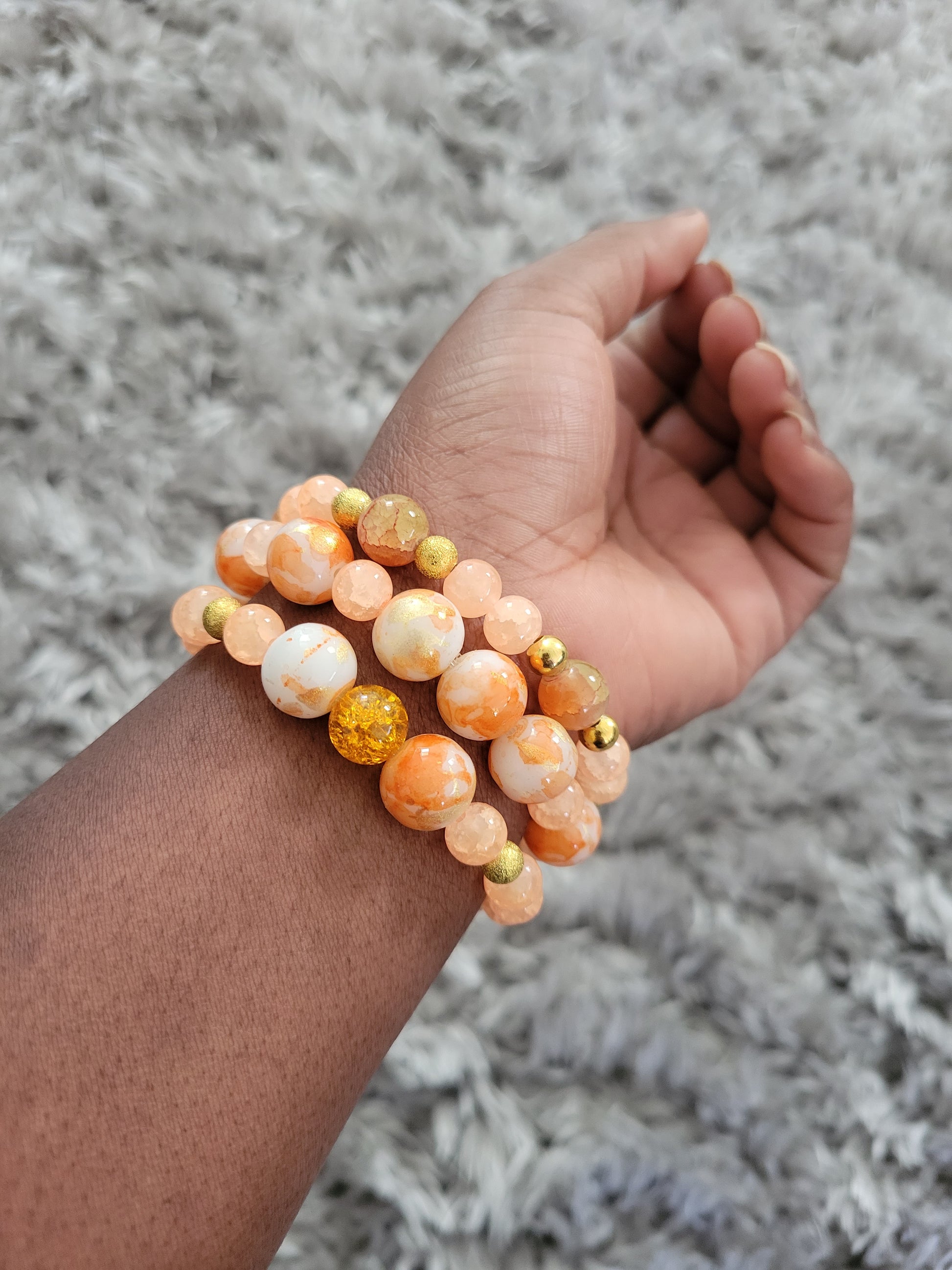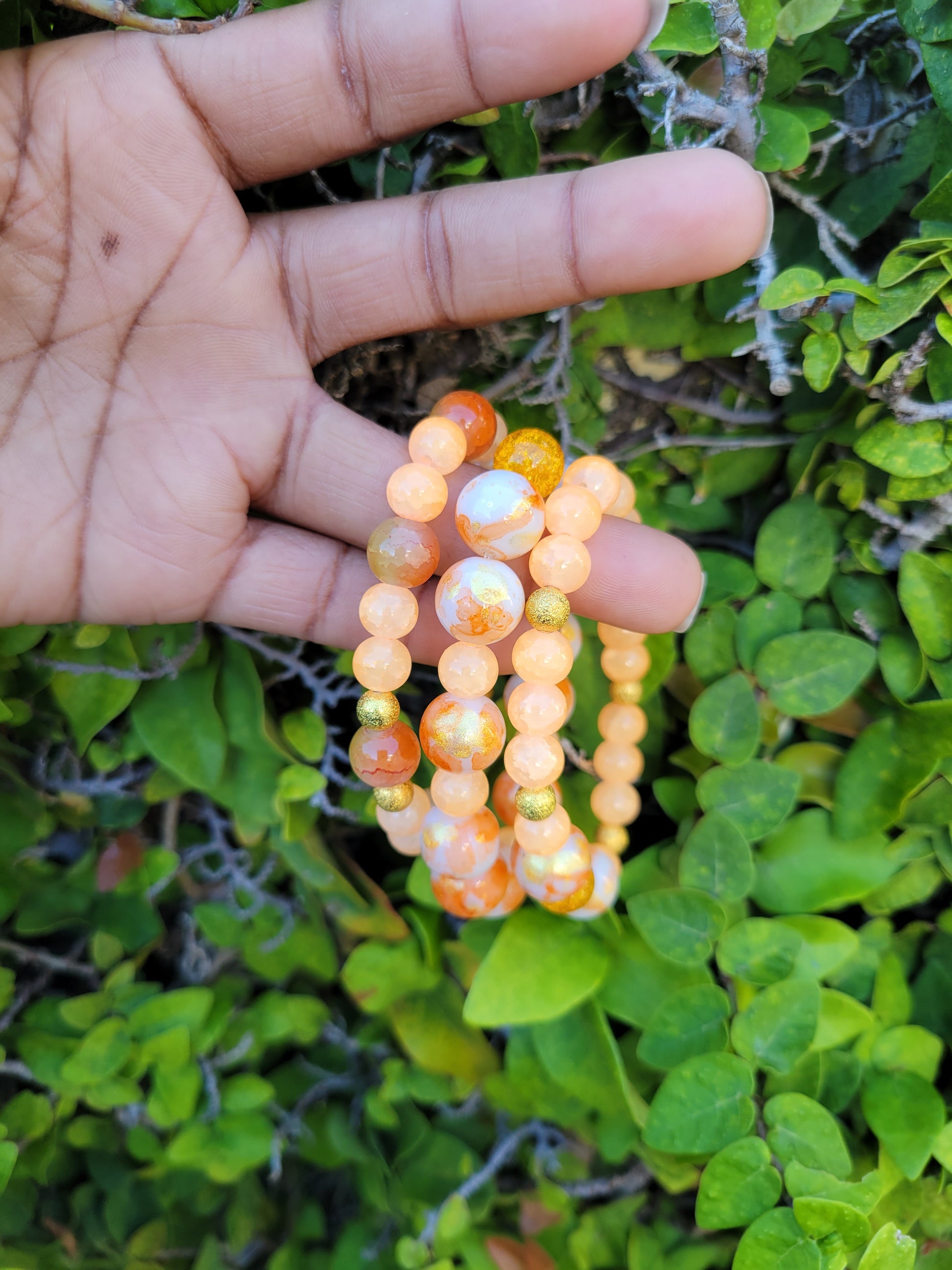 Handmade 3-stack orange and white bracelet with gold accents. Standard bracelet size 7.25"