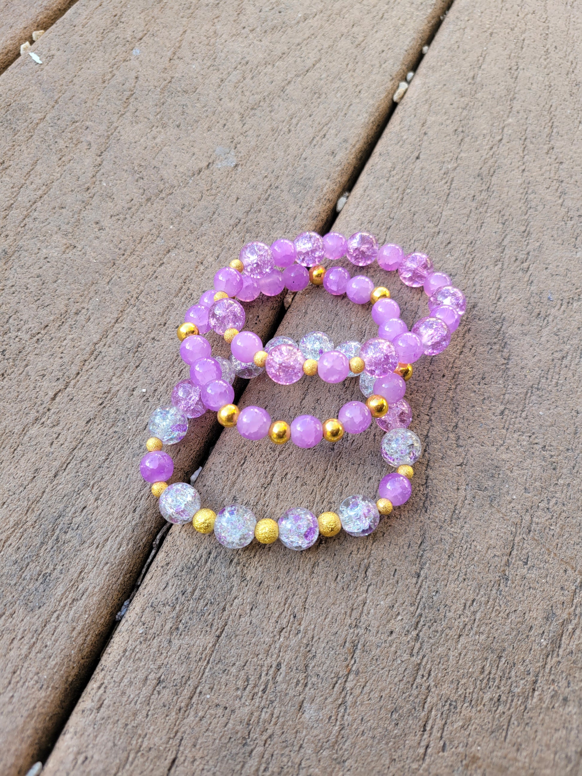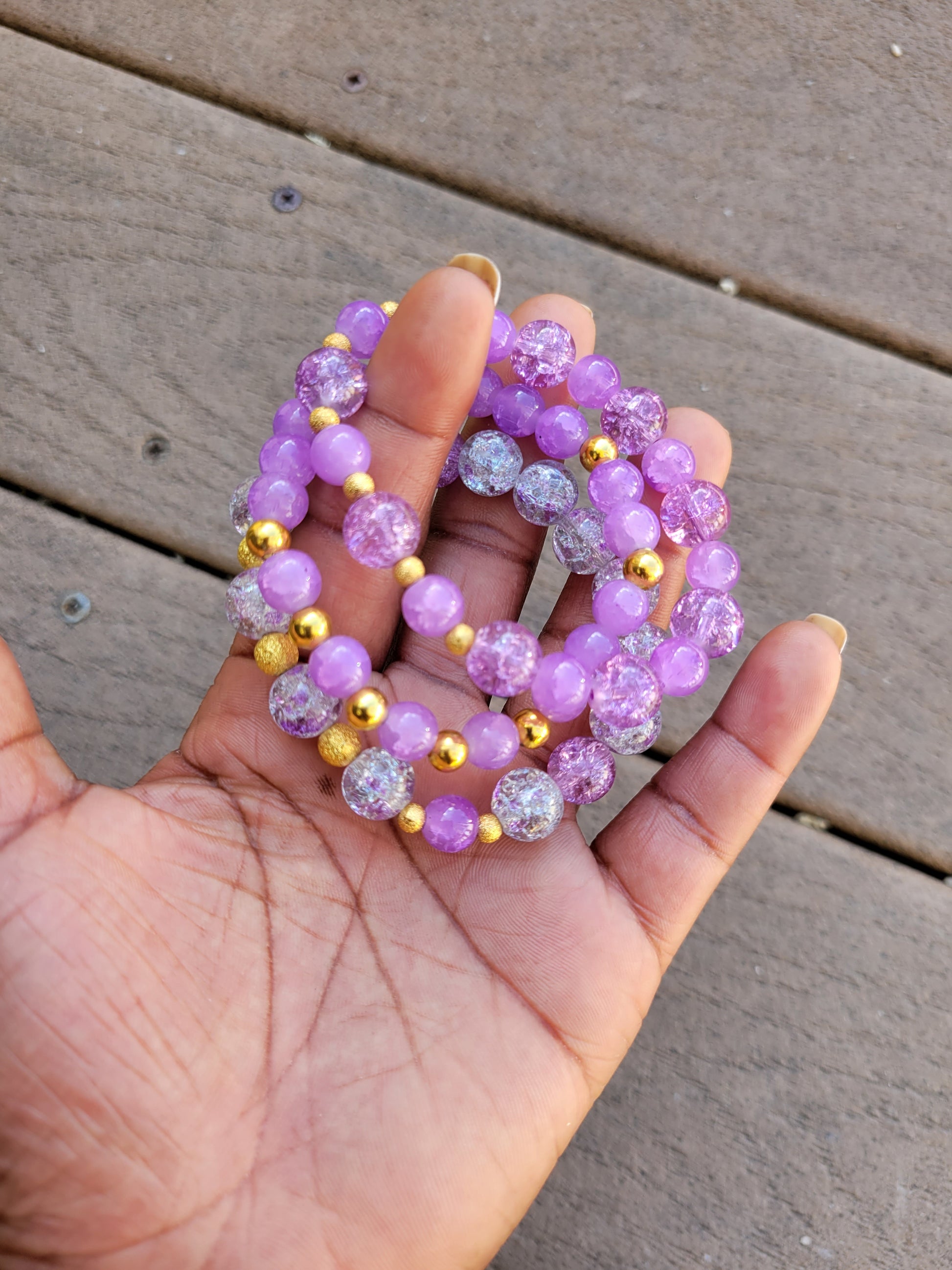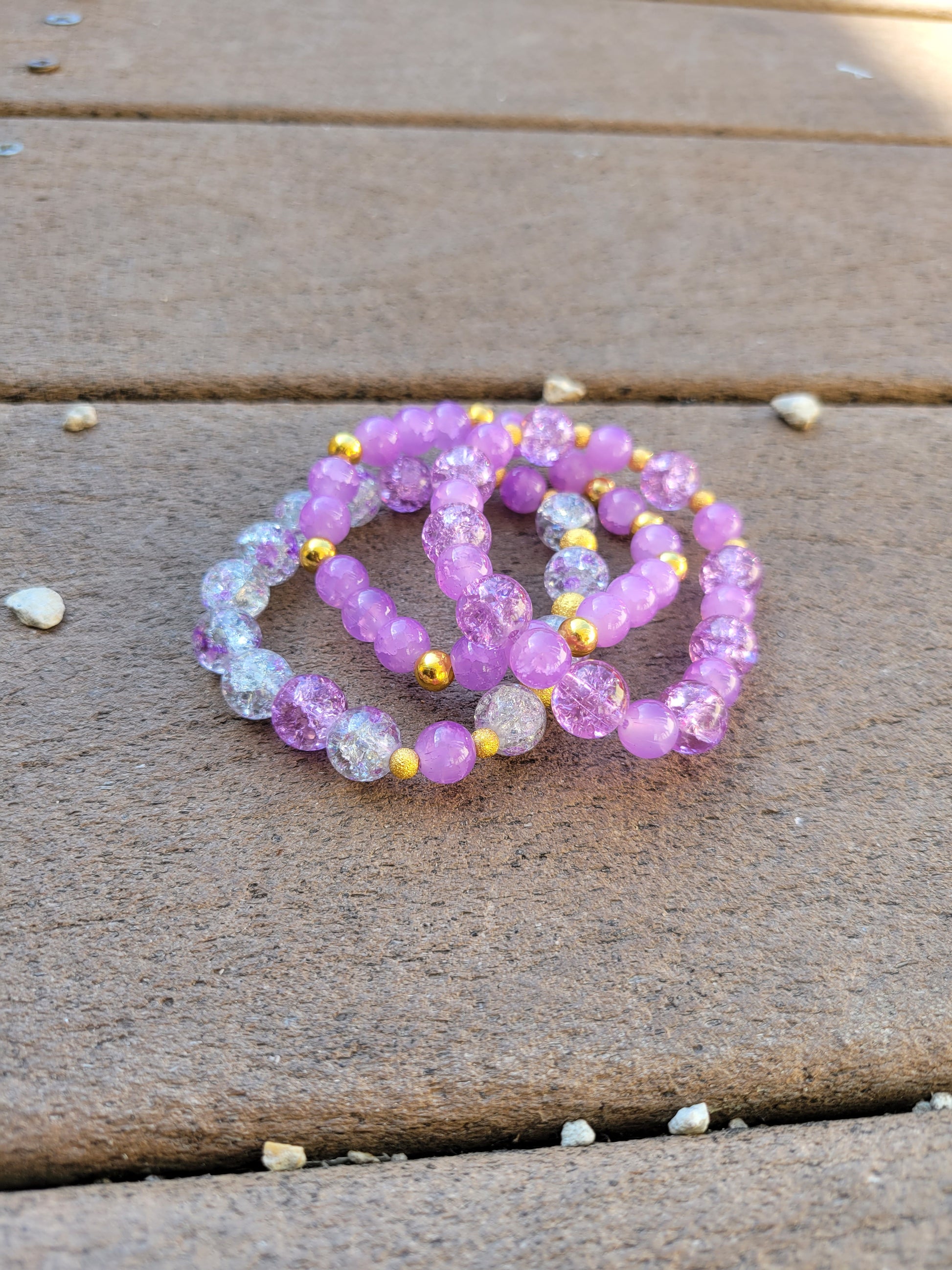 Handmade 3-stack jade style purple bracelet with gold and and crystal crackle bead accents. Standard bracelet size 7.5"