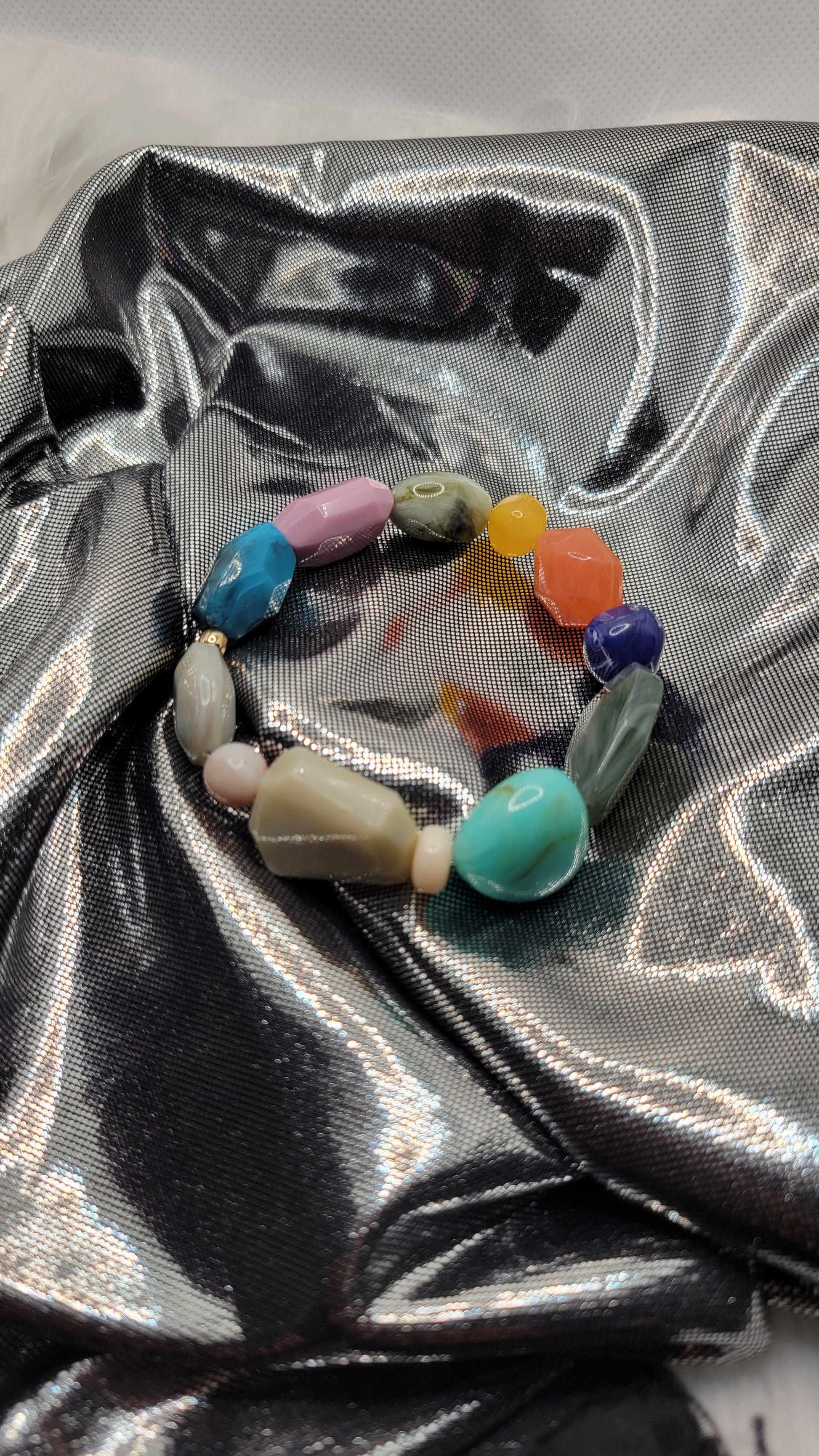 All pieces are made with a variety of precious or semi precious beads and other materials such as spacer beads, metal/non metal charms, jewelry elastic and non elastic string.